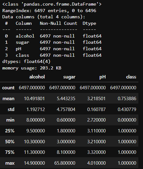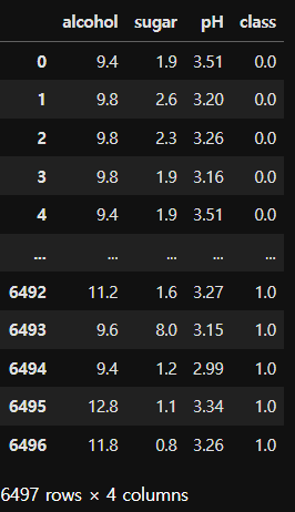 - 종속변수 : class(와인종류; 0 또는 1, 0은 레드와인, 1은 화이트와인)