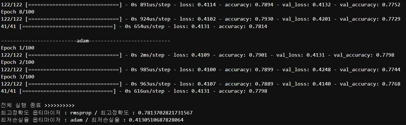 - 옵티마이저 모두 적용 후 가장 좋은 성능일 때 옵티마이저 확인해 보기