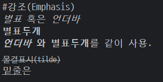 ▶ **_이텔릭체_ 와 두껍게**를 같이 사용가능. - 취소선 : ~~취소선~~ 물결표시 사용.