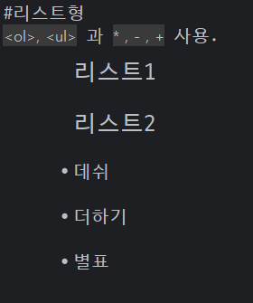 - `<ol>, <ul>` 과 ` * , - , +` 사용.