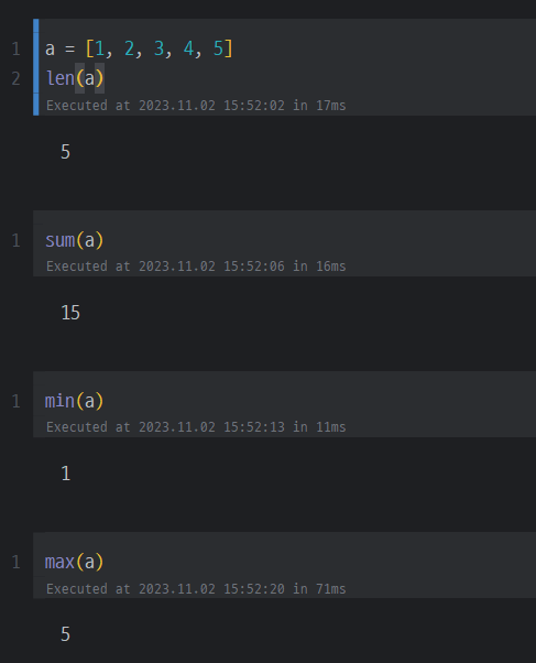 - sum, min, max 함수 : 리스트 요소의 총합, 최소값, 최댓값