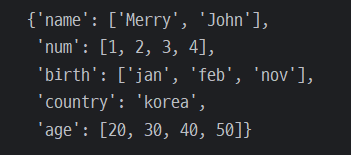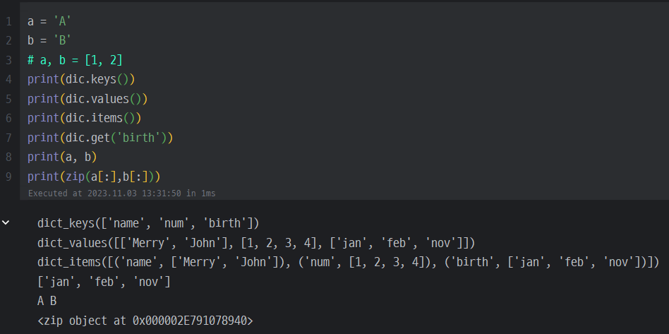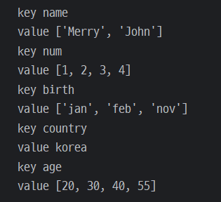 - 조건 : 키, 벨류 길이가 같아야함 (len)