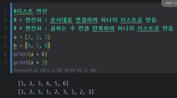 + 연산자 : 순서대로 연결하여 하나의 리스트로 만듬