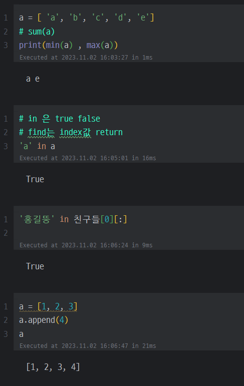 - in : 특정 요소가 리스트에 있는지 확인하는 함수