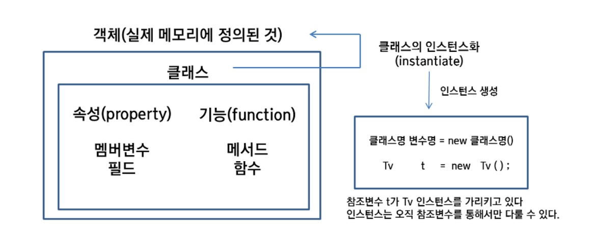 - class-> object(객체)-> 인스턴스(실제 메모리에 올라와서 실행되고 있는 상태)