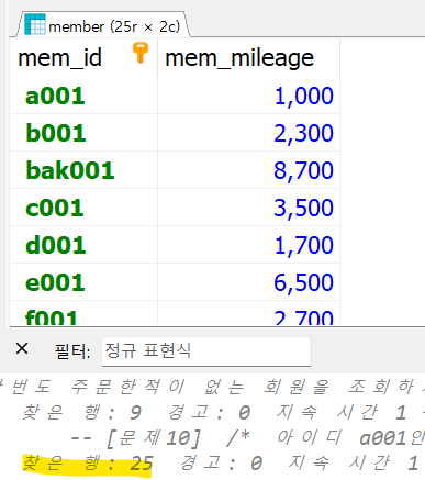 아이디 a001인 회원이 가지고 있는 마일리지보다 이상인 회원조회