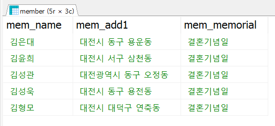 AND SUBSTRING(mem_add1, 1, 2) IN ('서울', '대전')