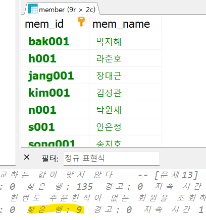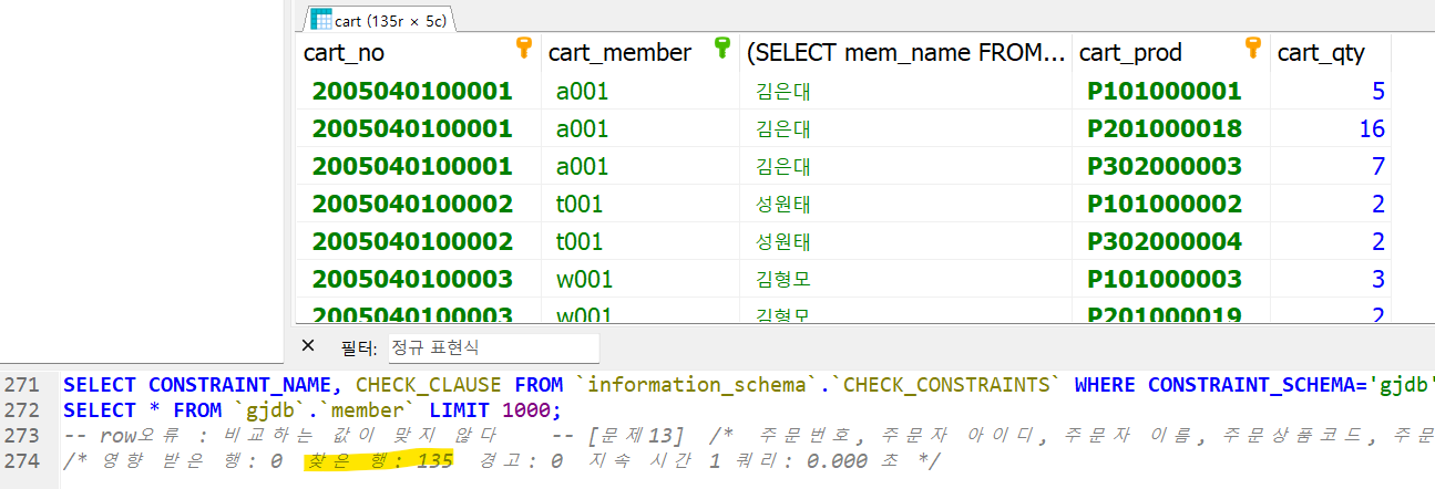 "나는 cart_member 랑 일치하는 mem_id를 조건으로 줘서 회원주소를 앞에서 두 글자 가져왔다. 그리고 그 회원주소가 서울 또는 대전을 만족하는 경우의 조회컬럼들을 가져왔다. "