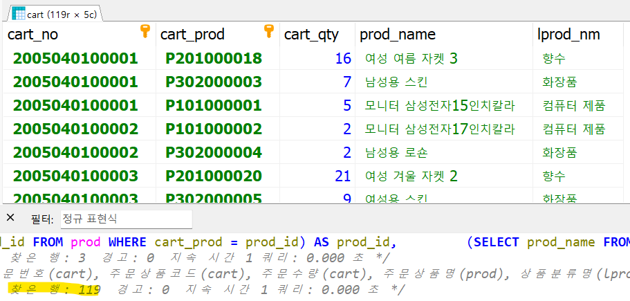 (SELECT lprod_nm FROM prod, lprod WHERE (lprod_gu = prod_lgu) AND (prod_id = cart_prod)) AS lprod_nm