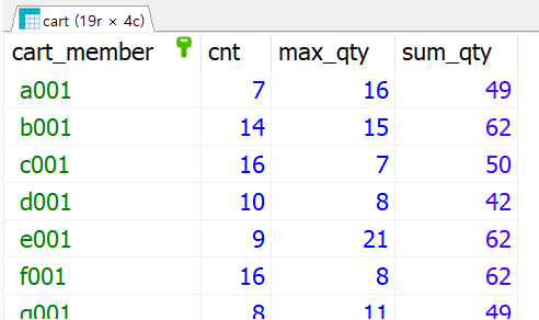 SELECT cart_member, COUNT(*) AS cnt, MAX(cart_qty) AS max_qty,