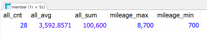 - SUM(expr): 특정 열의 합을 계산합니다.
