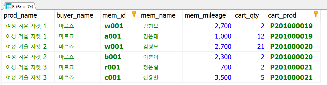 SELECT B.prod_name, B.cart_prod, B.buyer_name, B.mem_id, B.mem_name, B.mem_mileage, B.cart_qty,