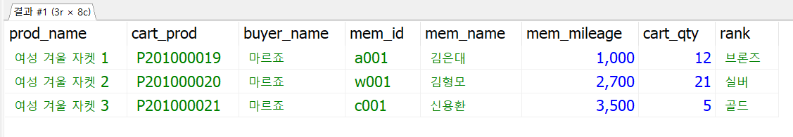 SELECT prod_name, buyer_name, mem_id, mem_name, mem_mileage, cart_qty, cart_prod