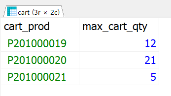 SELECT cart_prod, MAX(cart_qty) AS max_cart_qty