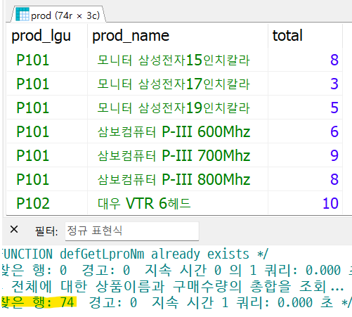 ※ GROUP BY prod_name, prod_lgu : 그룹이 두 개가 적용되었기 때문에 상품분류코드가 같더라도 이름이 달라서 합쳐지지 않음