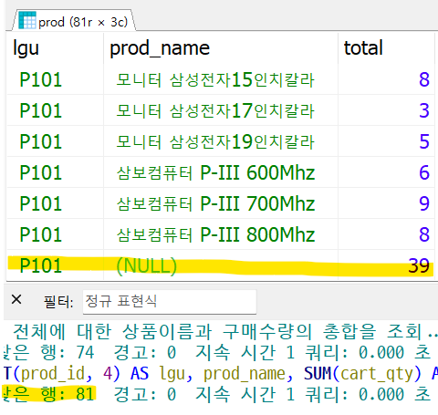 ex. lgu에 대한 그룹합계, prod_name에 대한 그룹합계, 전체합계