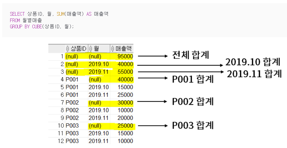 2. ROLLUP과 달리 GROUP BY절에 명시한 모든 컬럼에 대해 소그룹 합계를 계산해준다.