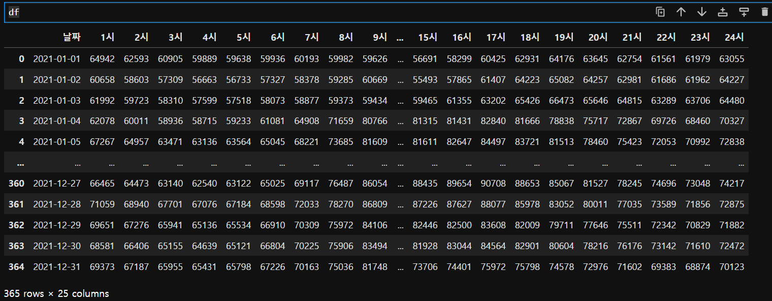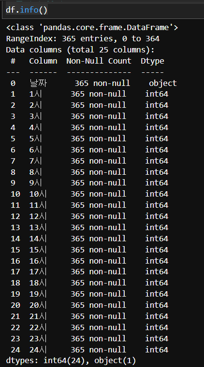 25개 컬럼?(24시간 데이터니까) → 너무 많음