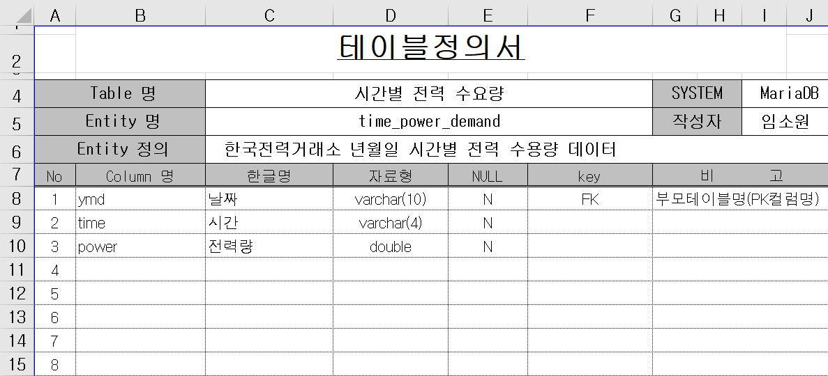 - 테이블명, 컬럼명, 컬럼타입, null 여부에 대한 정의가 필요함