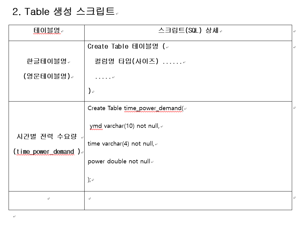 - 테이블명, 컬럼명, 컬럼타입, null 여부에 대한 정의가 필요함