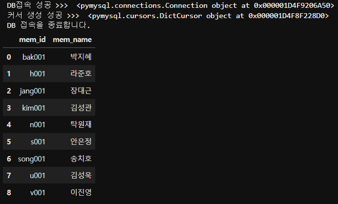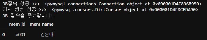 DB접속 성공 >>> <pymysql.connections.Connection object at 0x000001D4F7CB0AD0>