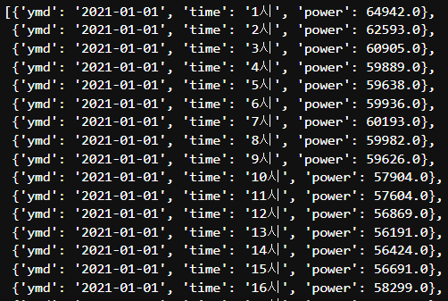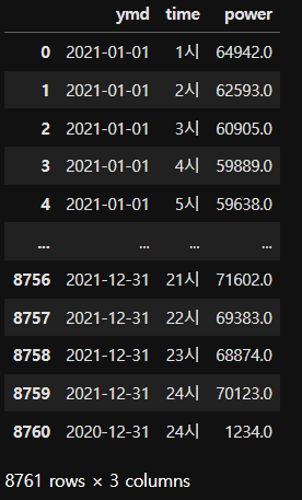 - 컬럼 생성 : ymd_power_df = pd.DataFrame(rows, columns=["ymd", "time", "power"])