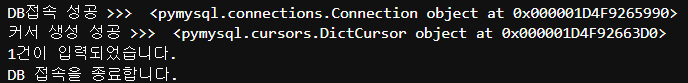 DB접속 성공 >>> <pymysql.connections.Connection object at 0x000001D4F7CB0AD0>