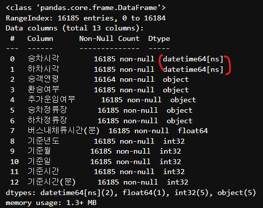 ### 3. 승차시각과 하차시각의 데이터타입을 날짜타입으로 변경하기(문자 타입만 datetime으로 변환가능하다.)
