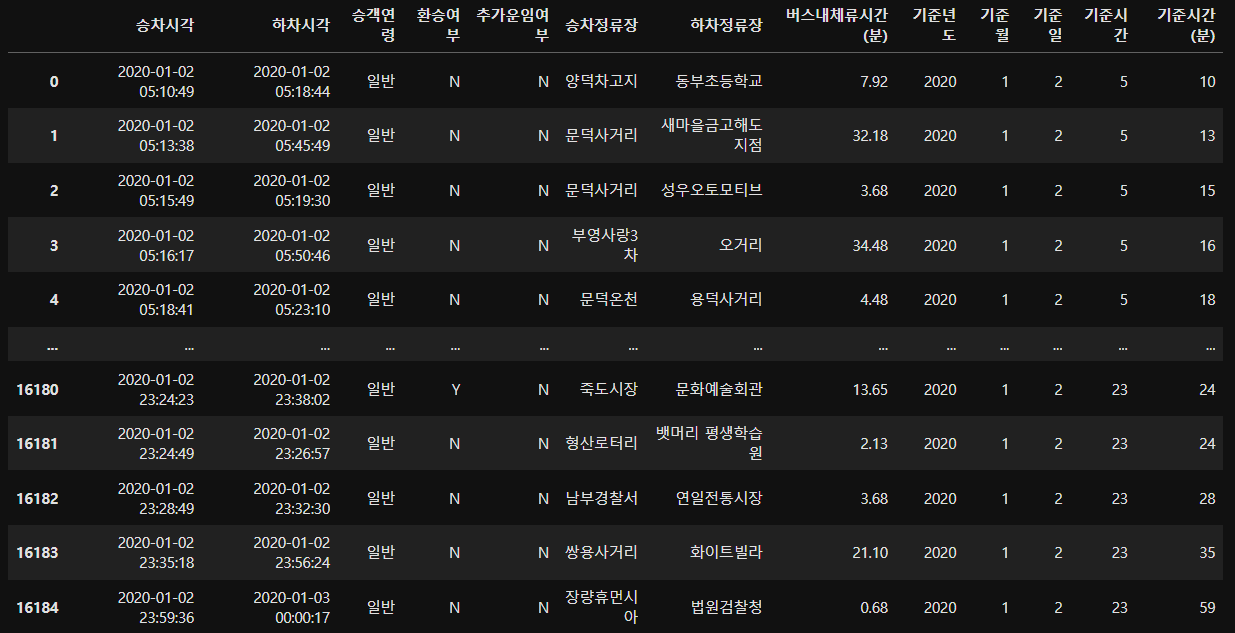 df_bus_card_tot1 = df_bus_card_tot1[["승차시각","하차시각","승객연령","환승여부","추가운임여부","승차정류장","하차정류장"]].copy()