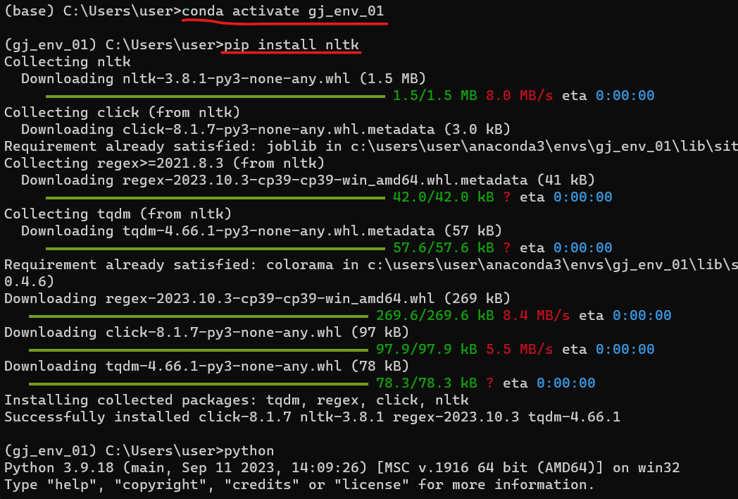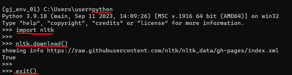 → 다른 가상환경에서는 pip install nltk 라이브러리만 설치하면 됨
