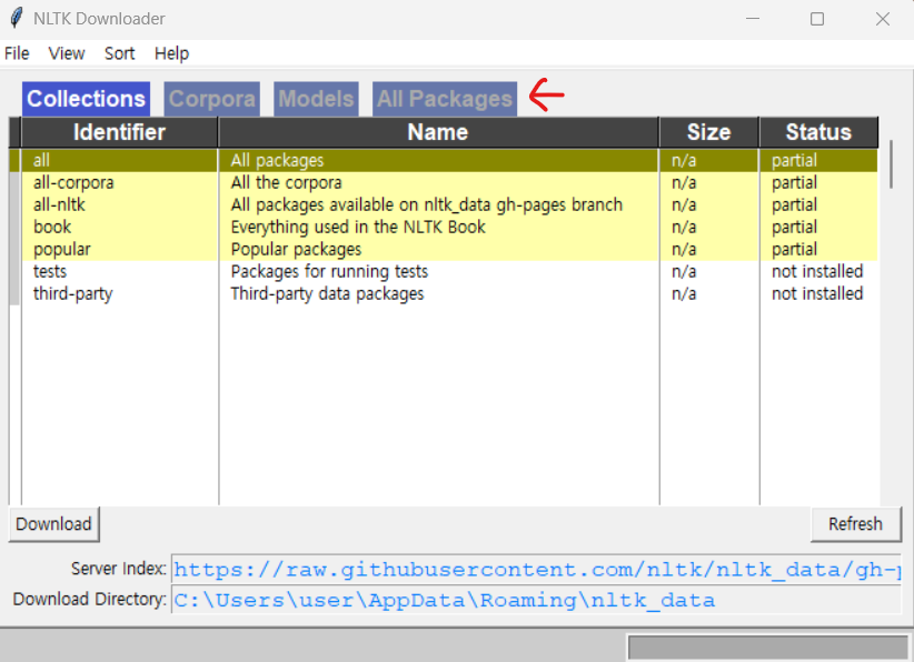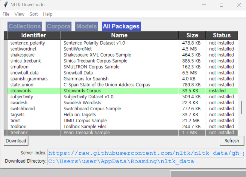 > All Packages 탭 선택 > punkt 더블클릭, stopwords 더블클릭