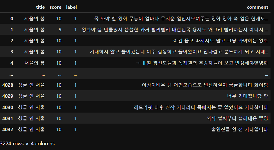 - 긍정 데이터프레임 변수명 : pos_reviews