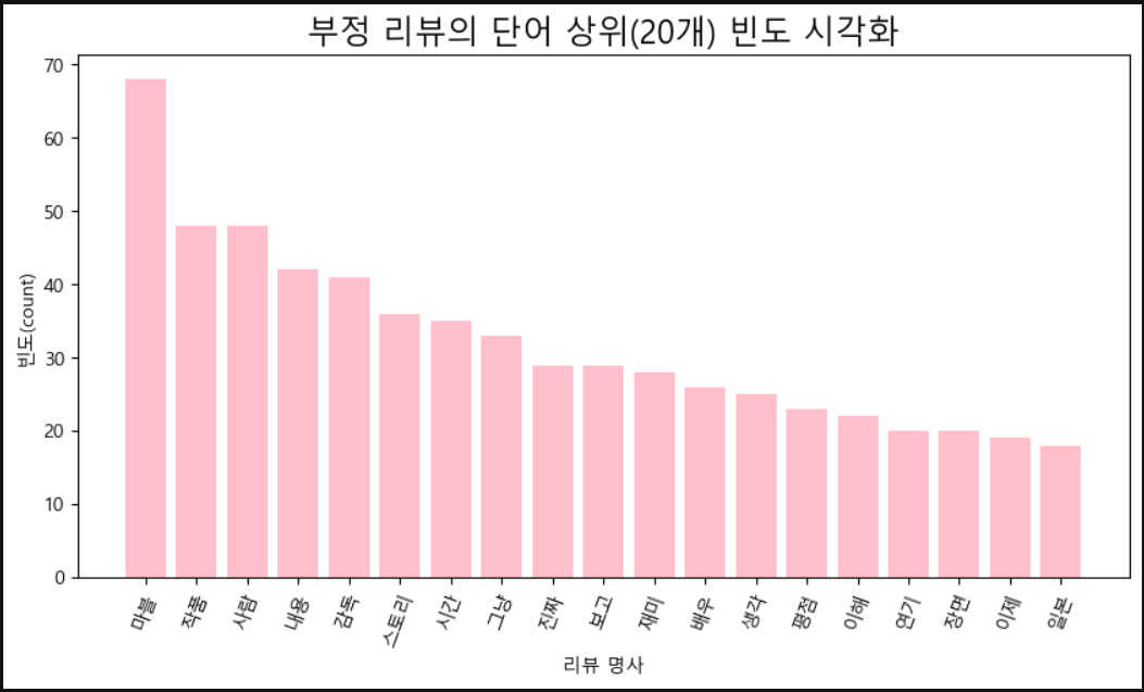 ### 부정 리뷰의 단어 상위(20개) 빈도 시각화