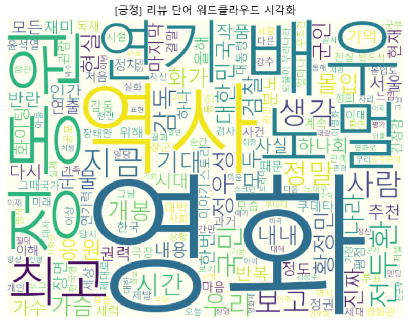 plt.title("[긍정] 리뷰 단어 워드클라우드 시각화")
