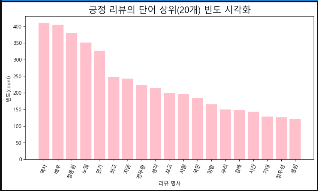 ### 긍정 리뷰의 단어 상위(20개) 빈도 시각화