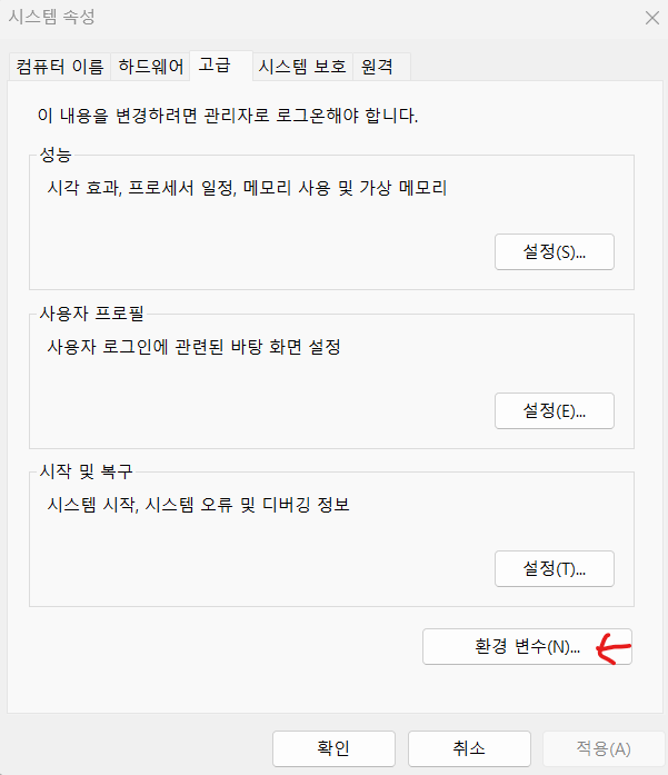 - 환경변수 등록 (파일탐색기>내 pc 마우스 우클릭 > 속성 > 고급시스템설정 > 환경 변수 )