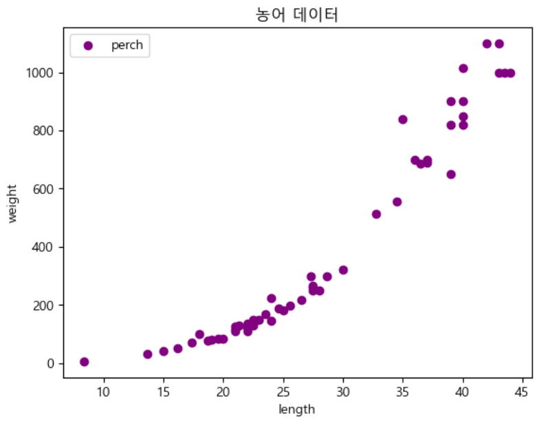 plt.scatter(train_input, train_target, c="purple", label="perch")